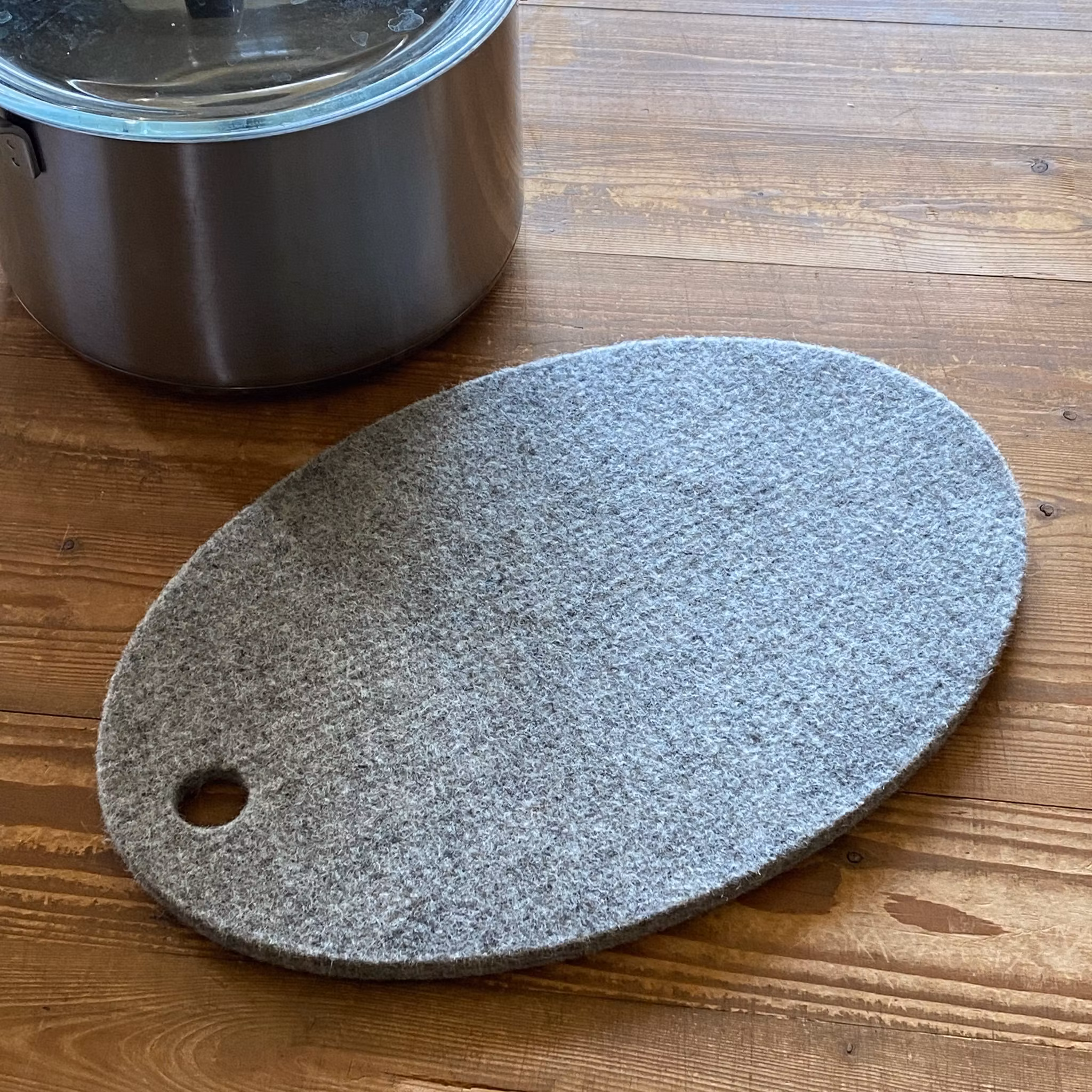 Stort ovalt grytunderlägg som passar både till långpannor och stora pajformar. Kan även funka som sittunderlag för barn :-)