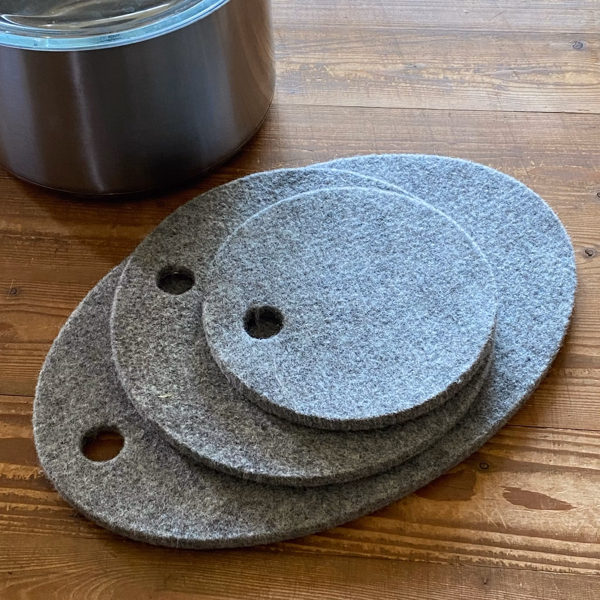 Mått 35 cm lång och 24 cm bred. Praktiskt hål att hänga upp den i. Ull tål höga temperaturer. Underlägget är ca 1 cm tjockt så det skyddar underlaget samtidigt som det isolerar och därmed hjälper till att hålla grytan varm.