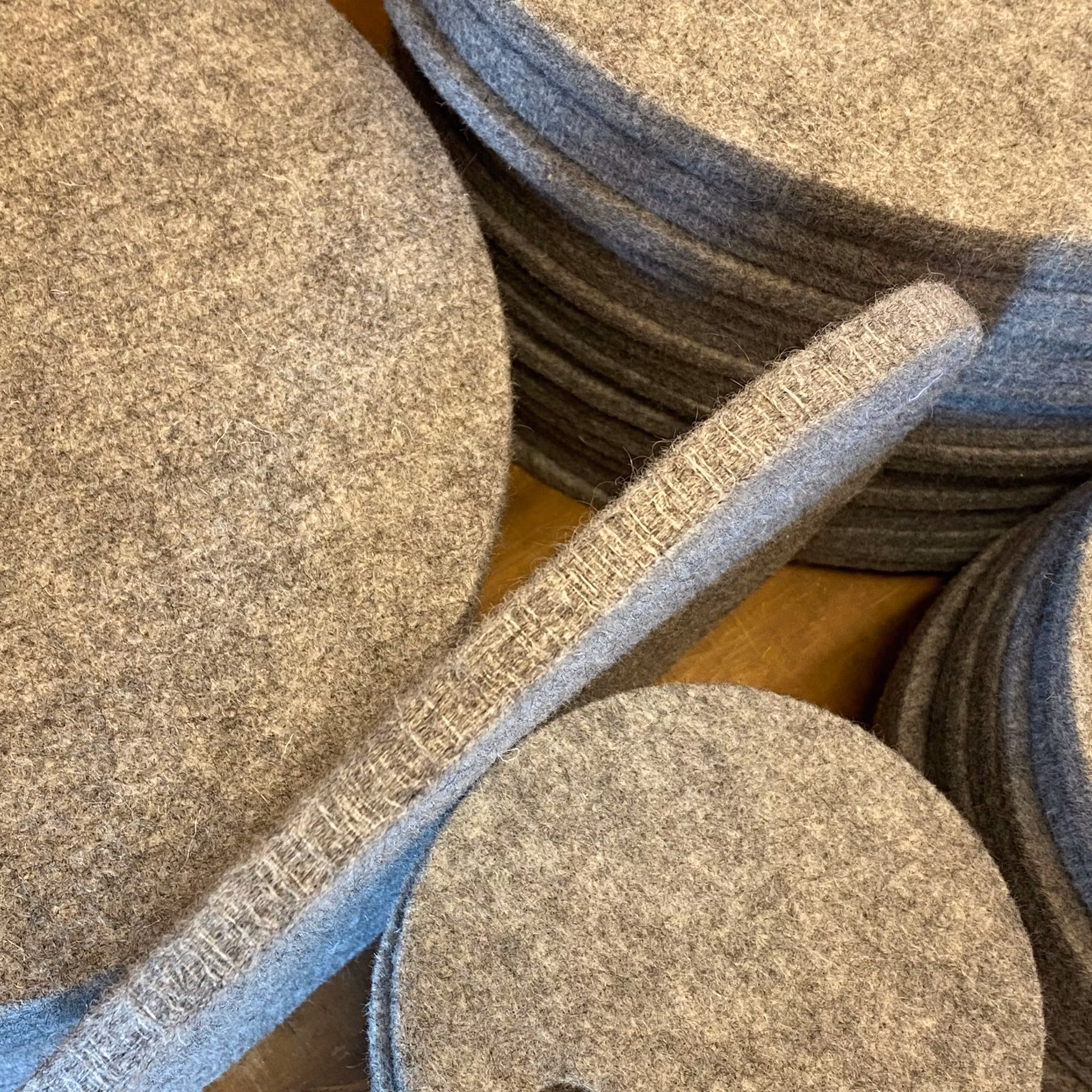 Liksom alla Ullkontorets produkter är detta en helsvensk produkt, alltså BÅDE tillverkad av Inhemsk ull OCH där alla förädlingssteg skett inom landet. Ullen är insamlad på Gotland och i Mellansverige, tvättad av oss på Gotland och sedan skickad till en fabrik i Halland som kardar, nålfiltar och skär ut den färdiga produkten. Vi har använt 50% grå ull från Gotlandsfår och 50% vit ull från olika korsningsfår för att få fram den ljusgrå färgen. Kombinationen fungerar bra både i produktionen och som smutstålig färdig produkt.