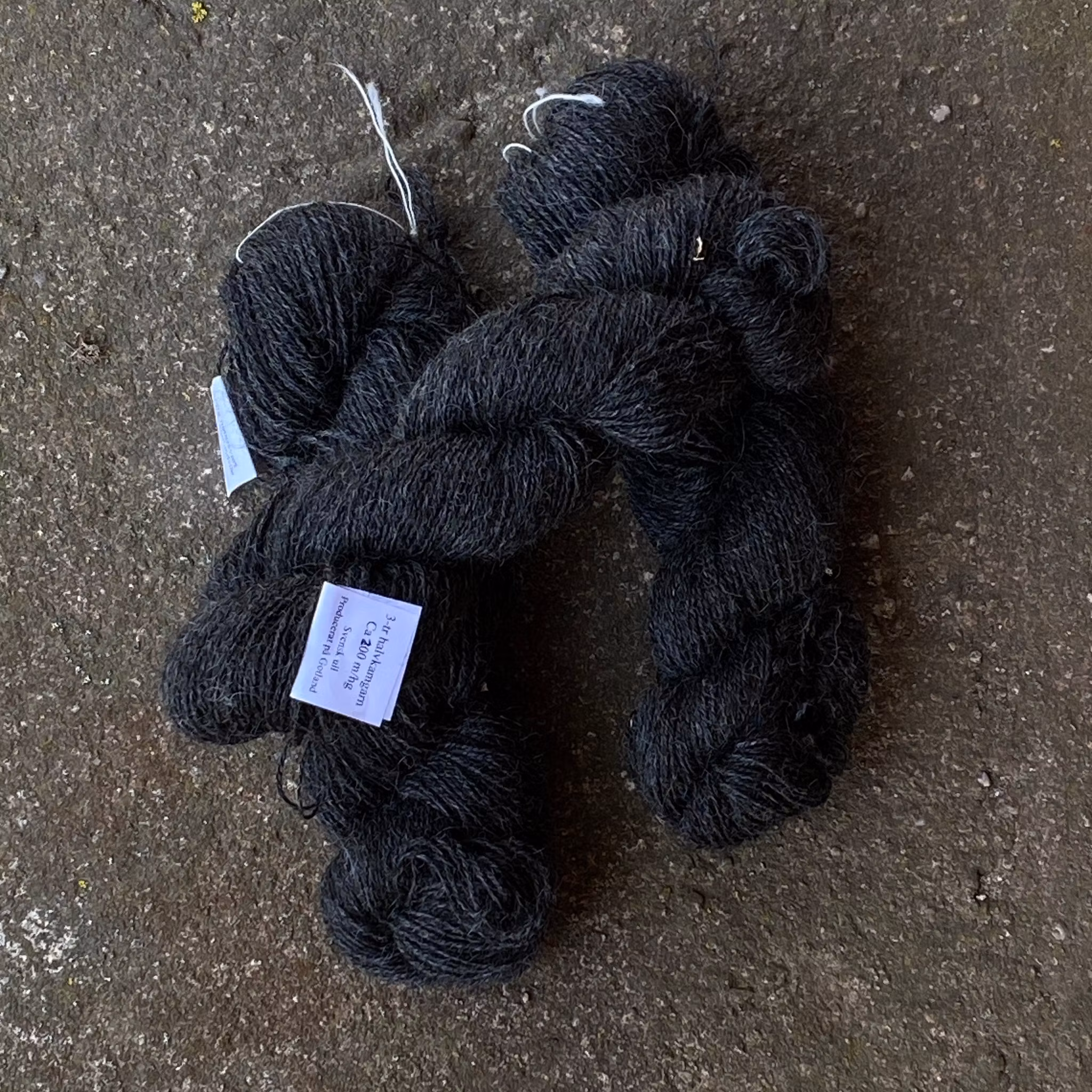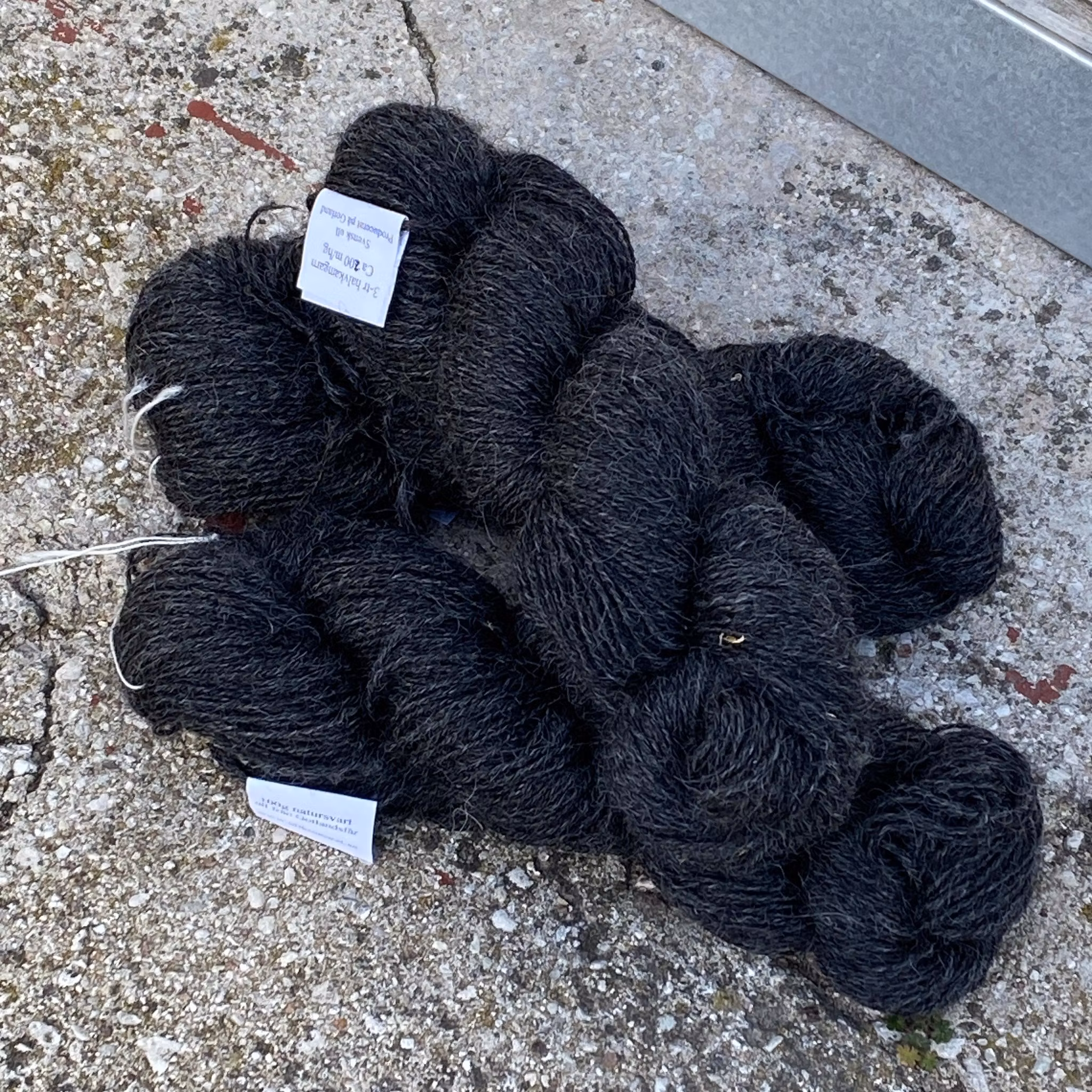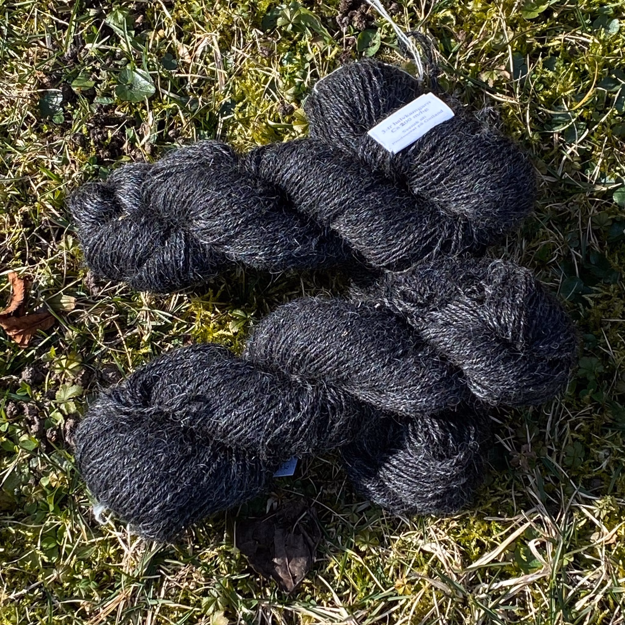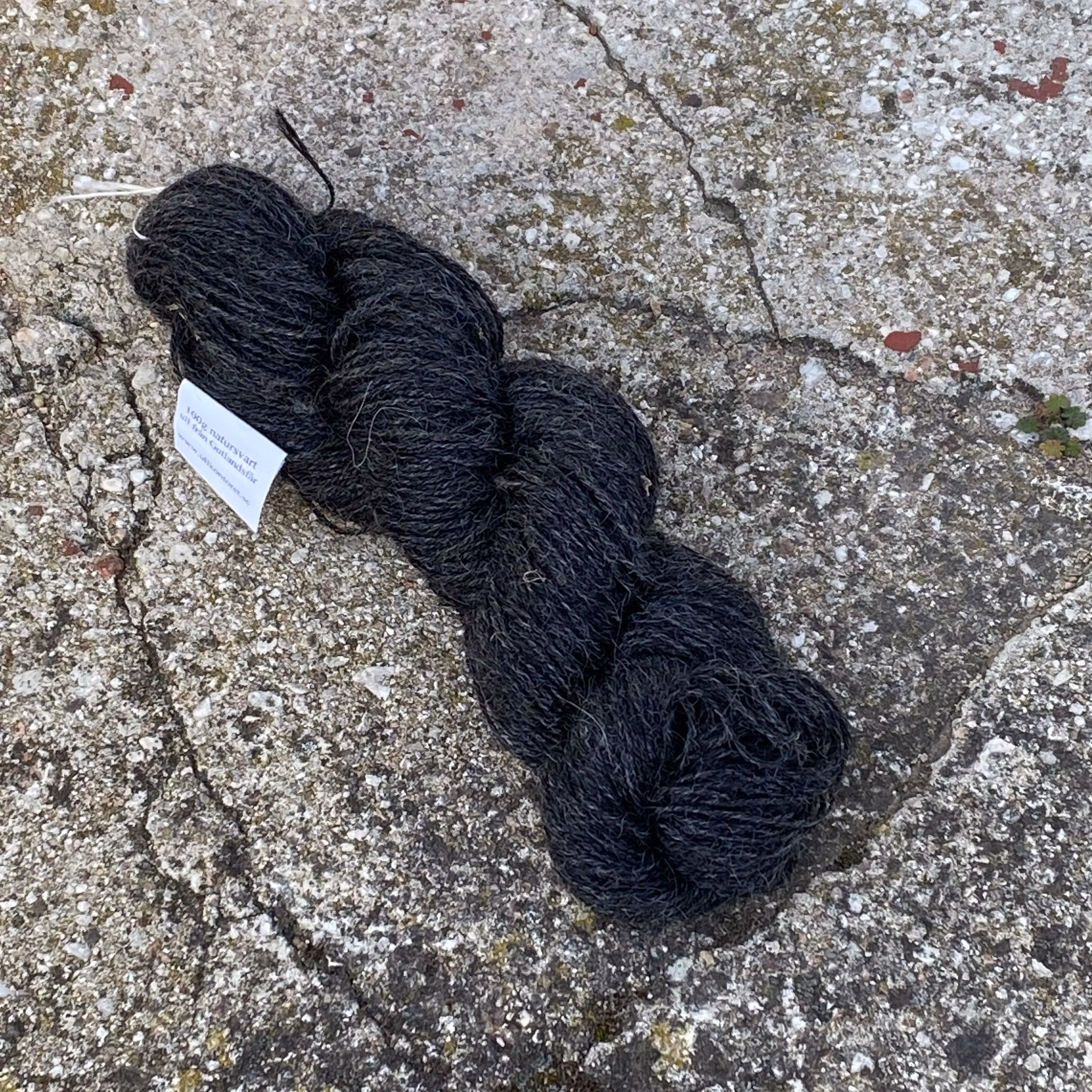 Vi har skapat ett natursvart garn genom att sortera fram de allra mörkaste lockarna på Gotlandsfåret och tvätta dem separat. Spunnet och tvinnat till tretrådigt halvkamgarn (Nm6/3) ca 200 m/hg. Detta är ett rätt kompakt och hårdtvinnat garn med fin lyster. Vid stickning så kan vi rekommendera stickar nr 2,5-4 men även andra stickor kan förstås passa beroende på vad man vill göra.