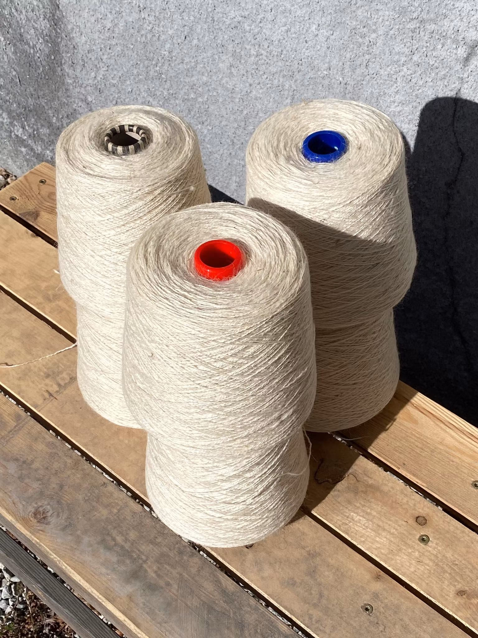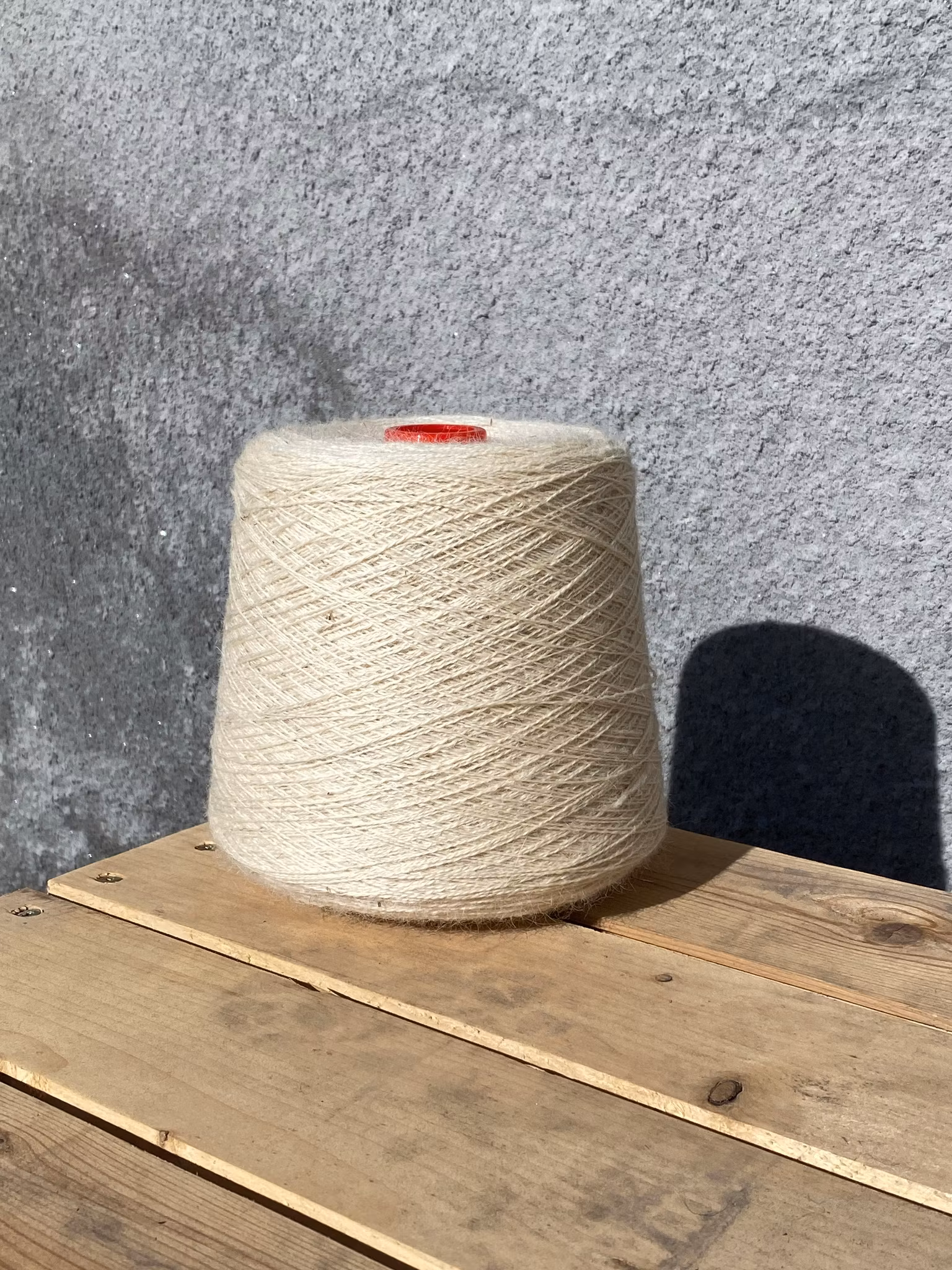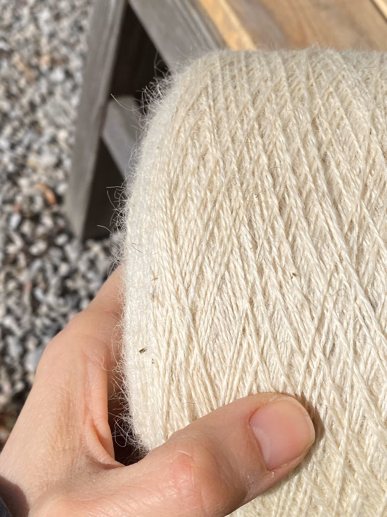 Detta är ett garn skapat av Leicesterfårets naturliga vita lockar. Ullen är spunnen och tvinnad till tvåtrådigt halvkamgarn (Nm6/2) ca 300 m/hg. Det är 1 kg på konen, så det blir ca 3000 m.