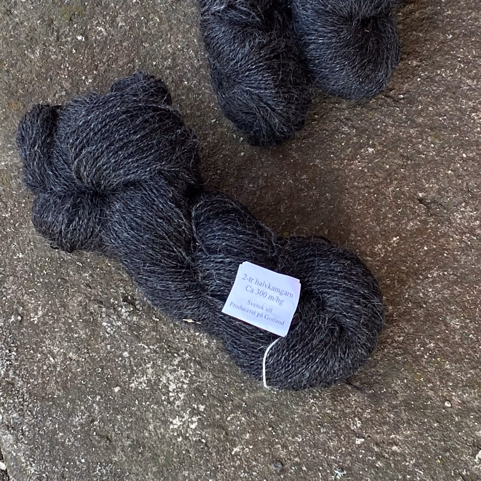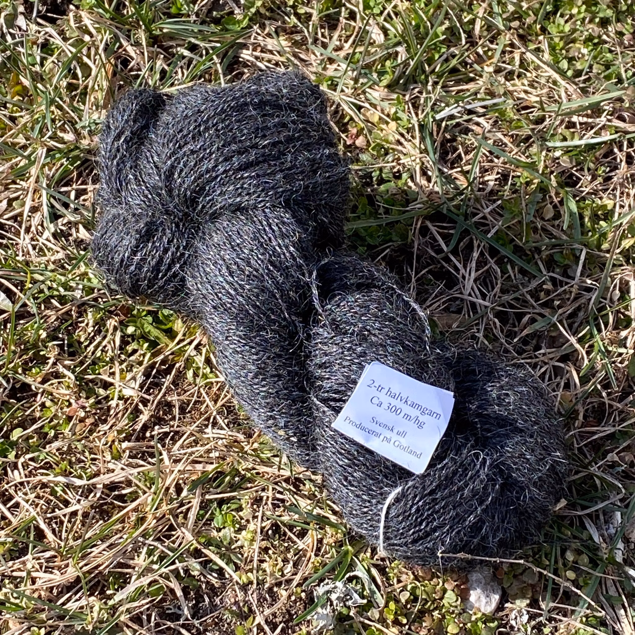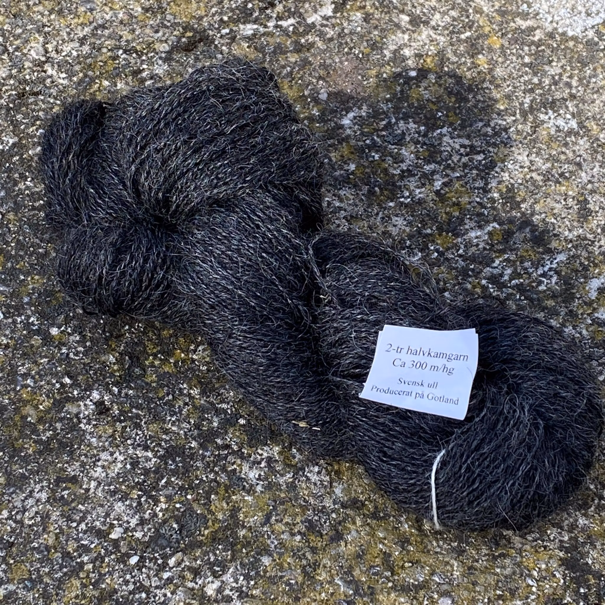 Vi har skapat ett natursvart garn genom att sortera fram de allra mörkaste lockarna på Gotlandsfåret och tvätta dem separat. Spunnet och tvinnat till tvåtrådigt halvkamgarn (Nm6/2) ca 300 m/hg. Detta är ett rätt kompakt och hårdtvinnat garn med fin lyster. Vid stickning så kan vi rekommendera stickar nr 2,5-3 men även andra stickor kan förstås passa beroende på vad man vill göra.