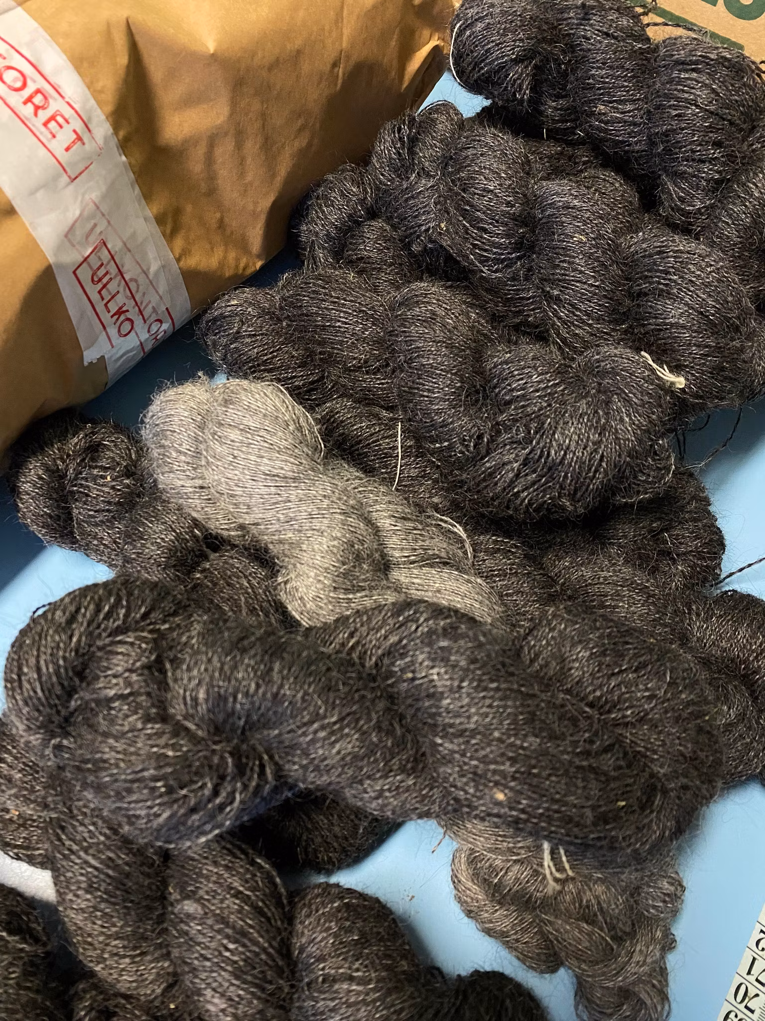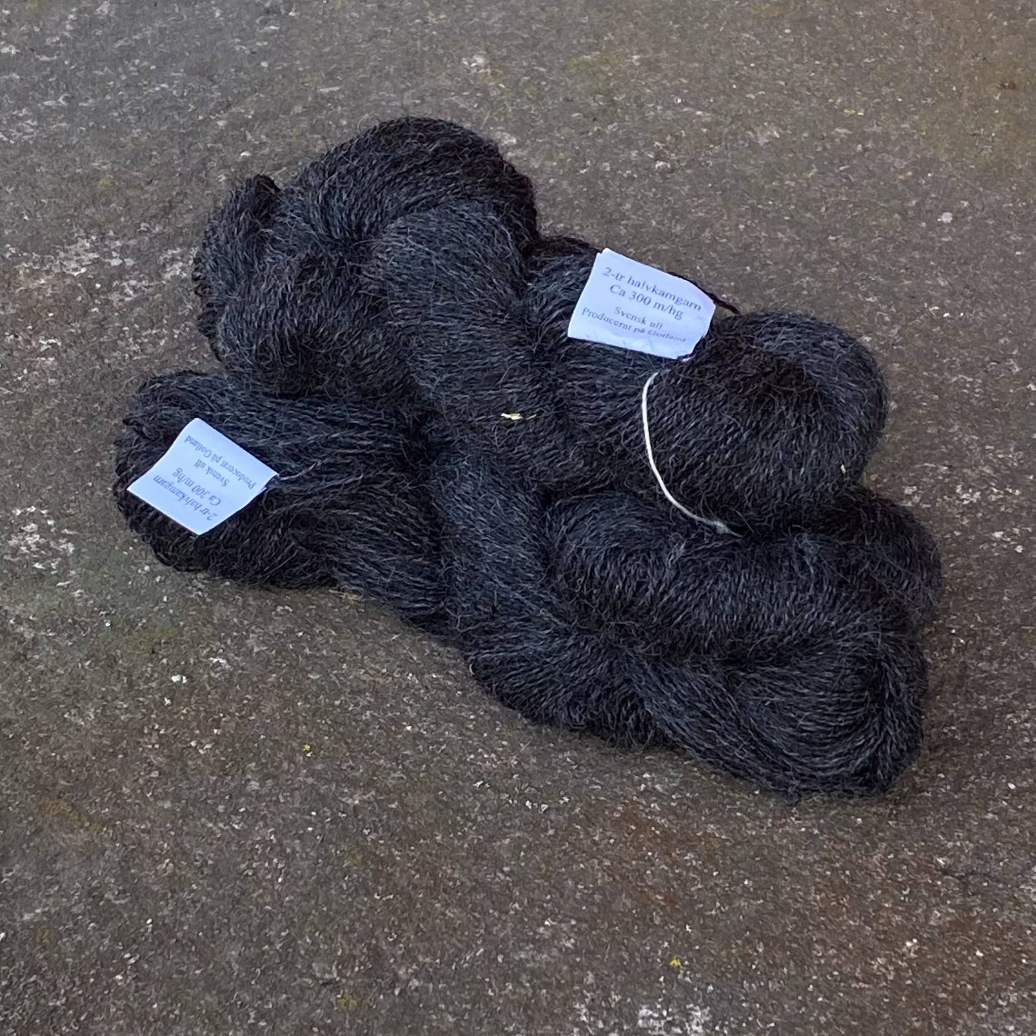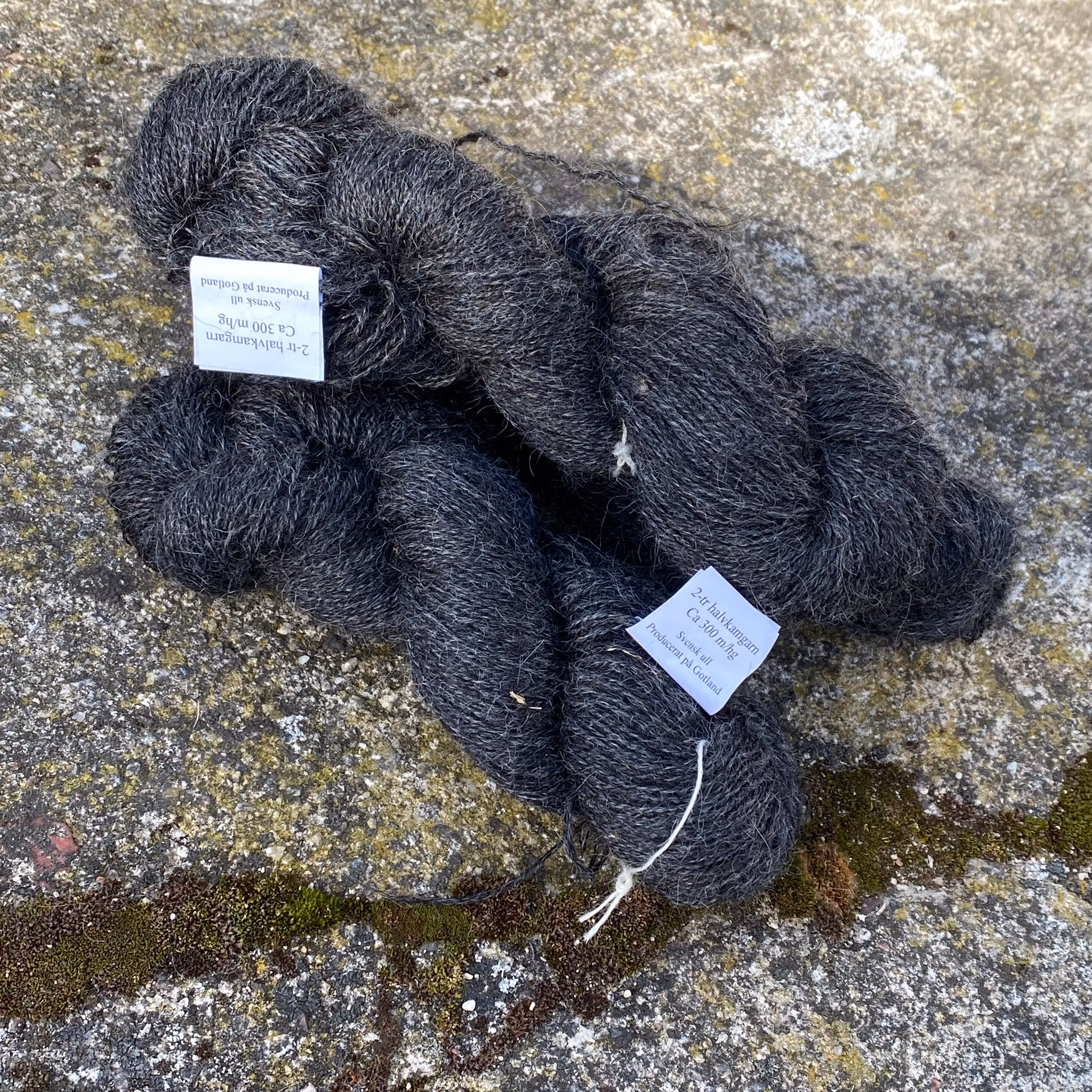 Vi har skapat ett natursvart garn genom att sortera fram de allra mörkaste lockarna på Gotlandsfåret och tvätta dem separat. Spunnet och tvinnat till tvåtrådigt halvkamgarn (Nm6/2) ca 300 m/hg. Detta är ett rätt kompakt och hårdtvinnat garn med fin lyster. Vid stickning så kan vi rekommendera stickar nr 2,5-3 men även andra stickor kan förstås passa beroende på vad man vill göra.