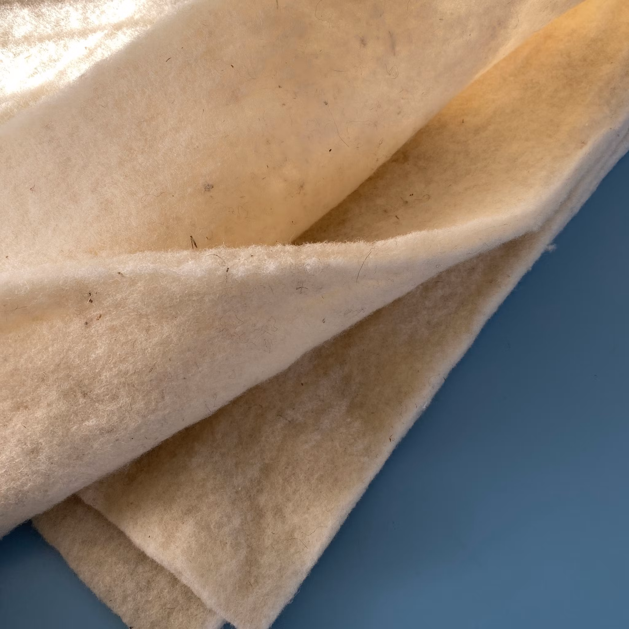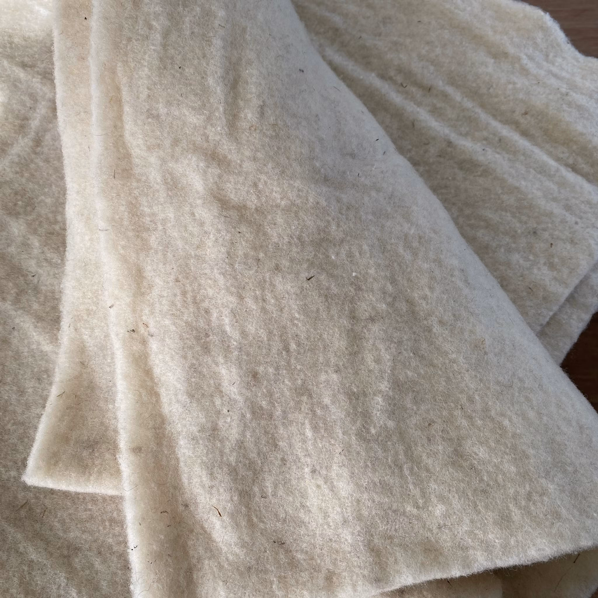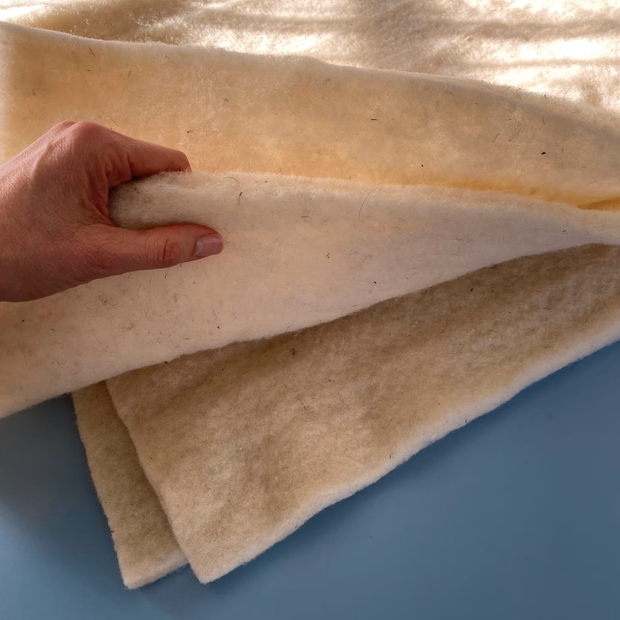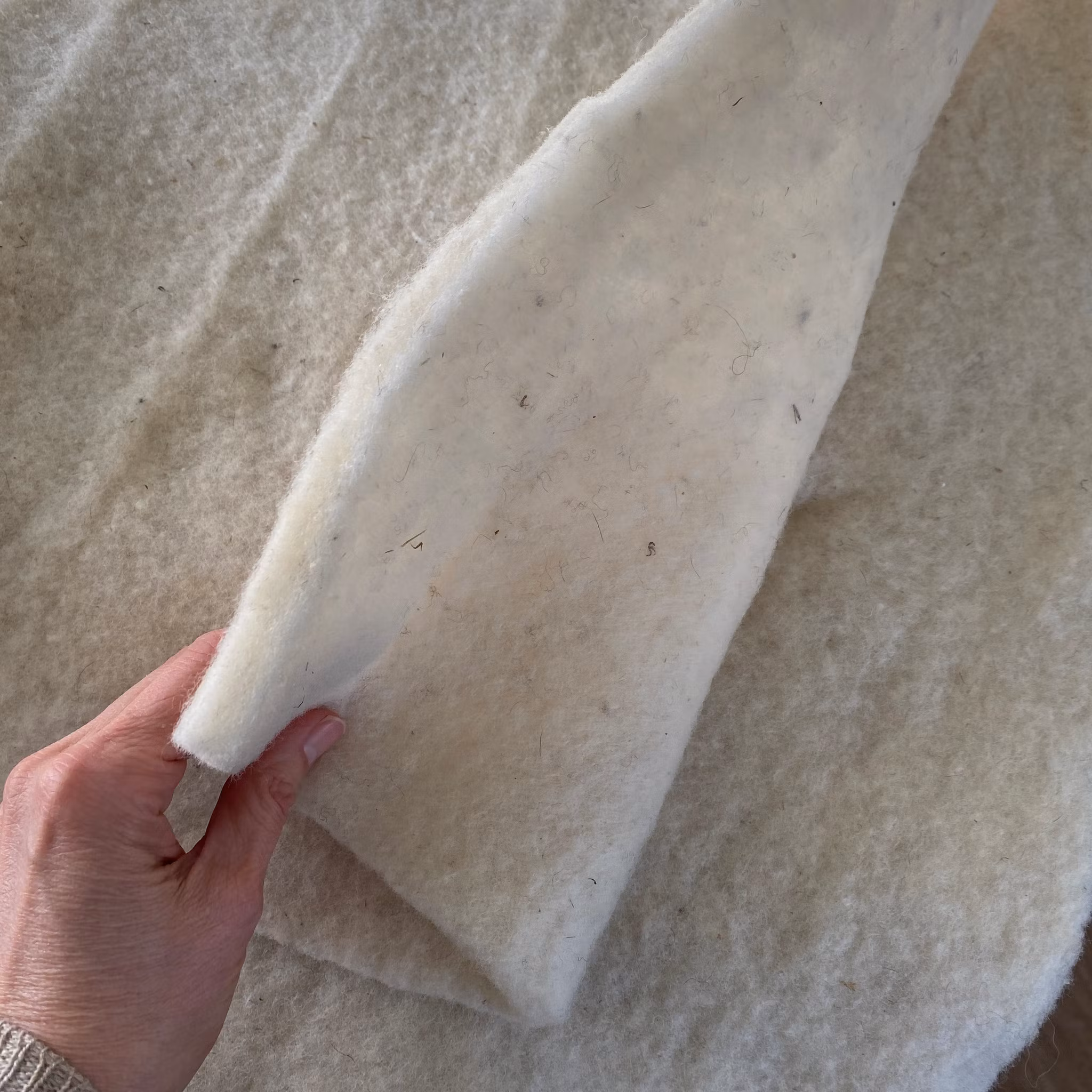 Nålfiltad ull från Suffolkfår. Färdig bit på 150 x 200 cm. Ca 1 cm tjock. Lämplig som mellanlägg i lapptäcken, för dig som vill tillverka en egen bäddmadrass i ullvadd eller som annan stoppning. Ytvikt 350g/m2. Tvättad av oss och kardad samt nålfiltad i Småland. Enbart ull från rasen Suffolkfår.